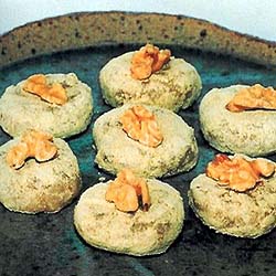 - 水で、濡らしたボールに取って、餅状 になるまでよくっき、5cm位の平たい丸型にし、きな粉をまぶし、中央 に大粒のくるみを乗せます。