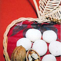 - 3.の中にくるみを入れ、40ヶの団子に丸め、天板に並べる。